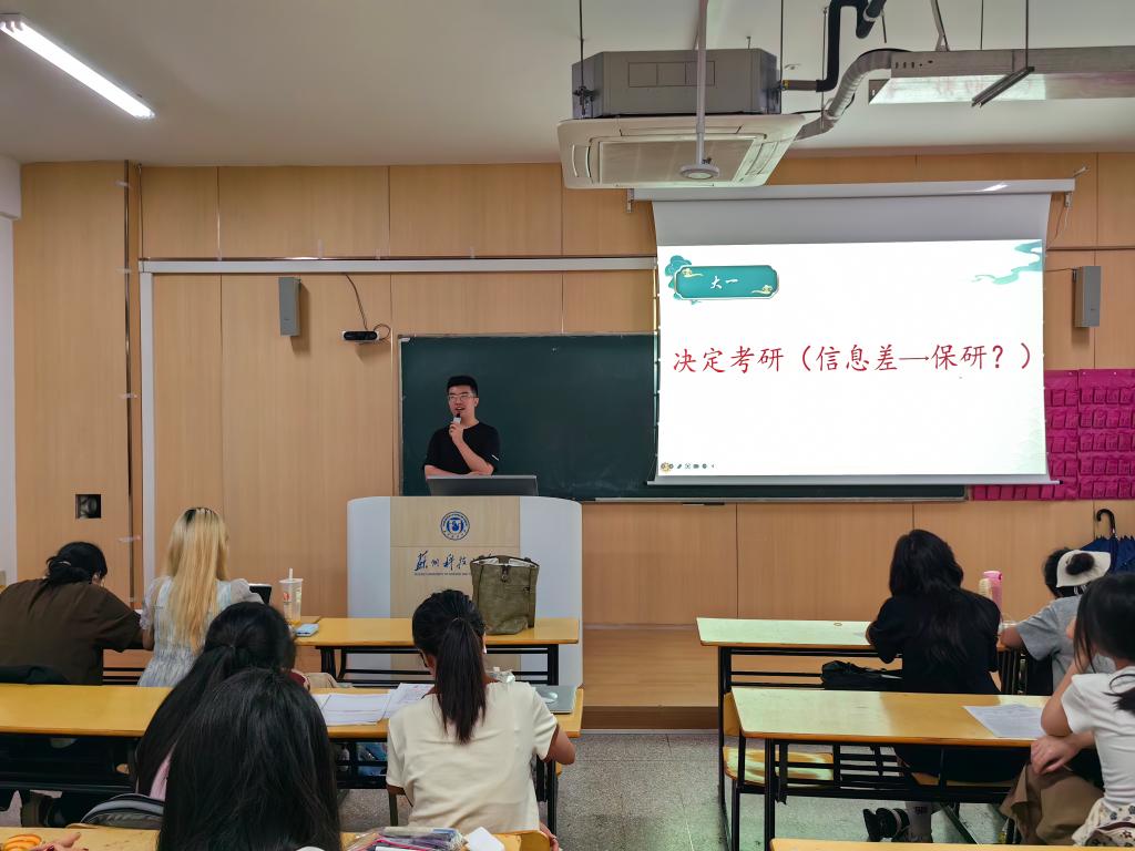 班会现场,三位毕业学生代表结合自身经历,展开干货满满的分享。考公方向的代表从岗位筛选、备考时间线规划、行测与申论复习技巧三个维度切入,详细拆解 “如何平衡学业与备考”“应届生考公优势利用” 等关键问题,还分享了面试礼仪与答题逻辑的实用心得;考研方向的代表聚焦院校选择策略、专业课复习方法、备考心态调节等核心话题,结合商科专业特点,建议同学们 “早定目标、分阶段推进”,并推荐了优质复习资料与线上学习平台;出国方向的代表则围绕语言考试备考、院校申请流程、文书撰写技巧、背景提升规划等内容展开讲解,重点强调了GPA保持、实习经历积累的重要性,还解答了同学们关于留学费用、院校排名与专业适配性的疑问。分享结束后,互动问答环节气氛热烈,24级学子针对自身困惑积极提问,毕业生代表逐一细致回应,现场交流氛围浓厚。