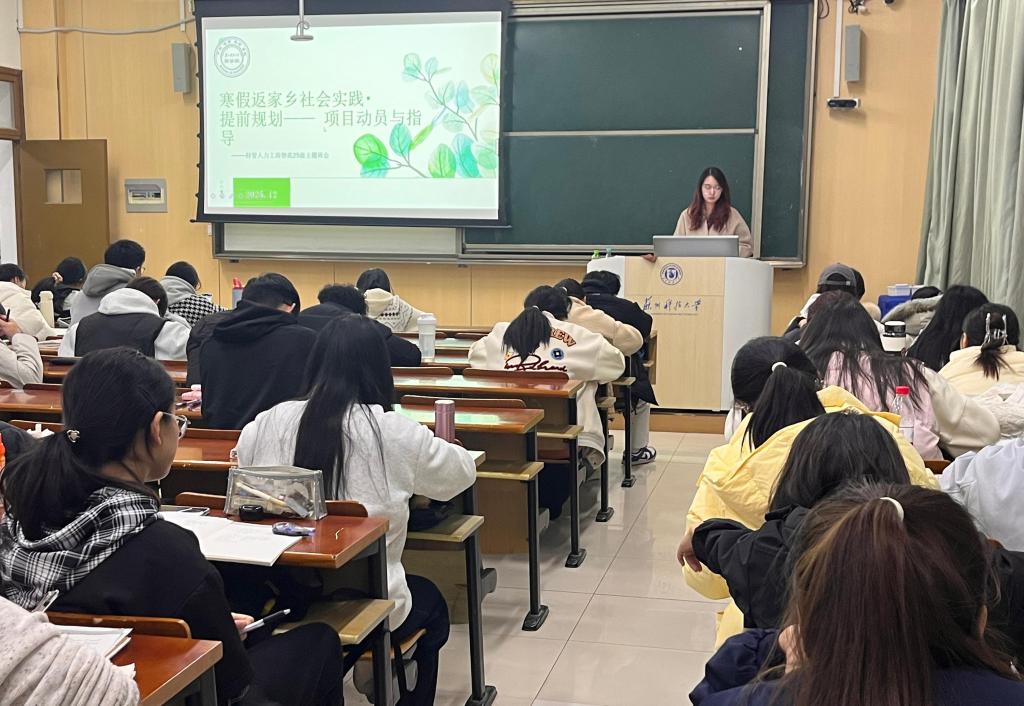 为鼓励学生利用寒假参与社会实践,提升综合素质与实践能力,12月8日,工商25、财管25、人力25、物流25班级开展寒假社会实践返家乡项目动员主题班会。