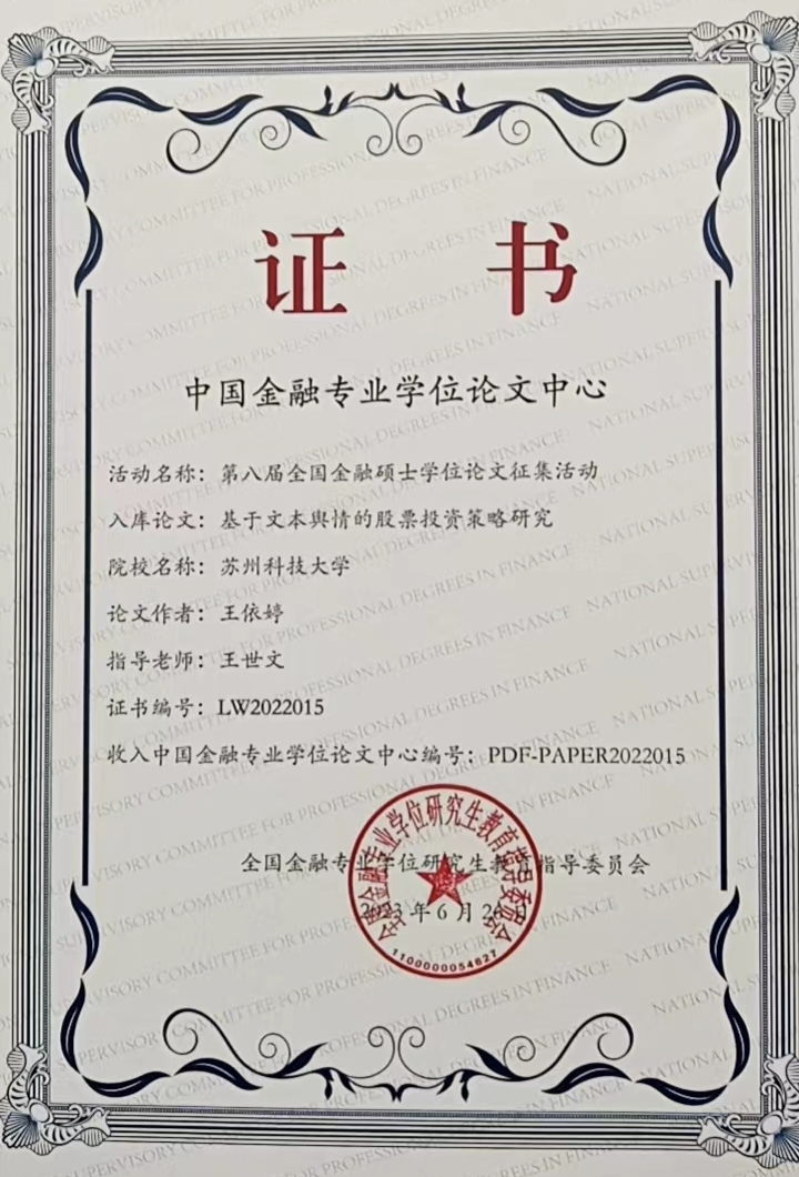 近日,第八届全国金融硕士学位论文征集活动结果已经公布,开云体育 王世文老师指导的学生王依婷的论文《基于文本舆情的股票投资策略研究》喜获优胜论文,收入中国金融专业学位论文中心。