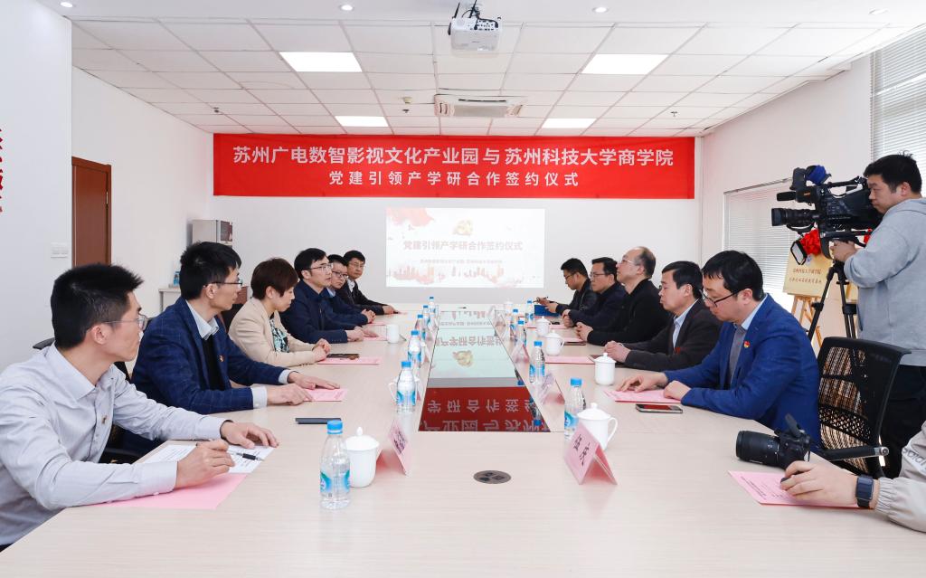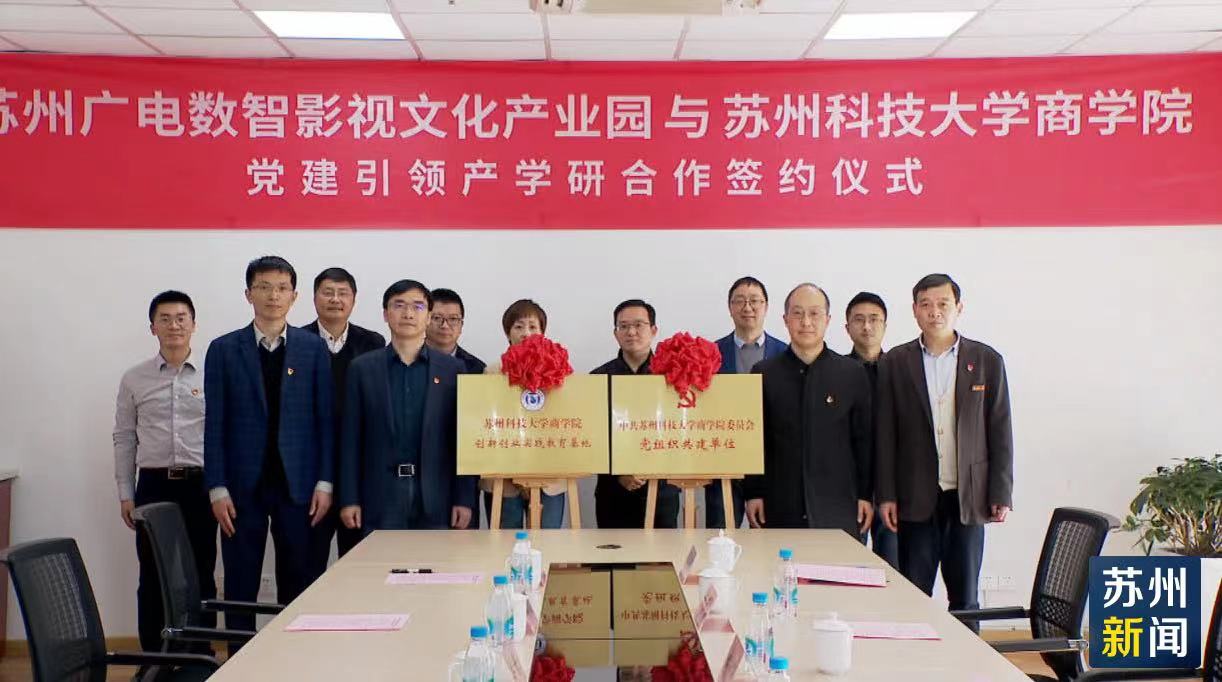 与苏州广电影视娱乐投资有限公司暨苏州数智影视文化产业园举办党建共建和产学研合作签约挂牌仪式。苏州广电总台党委委员、副总台长姜超、苏州广电影视娱乐投资有限公司影视城党支部书记、总经理姜飞、校党委组织部副部长徐治初、开云体育