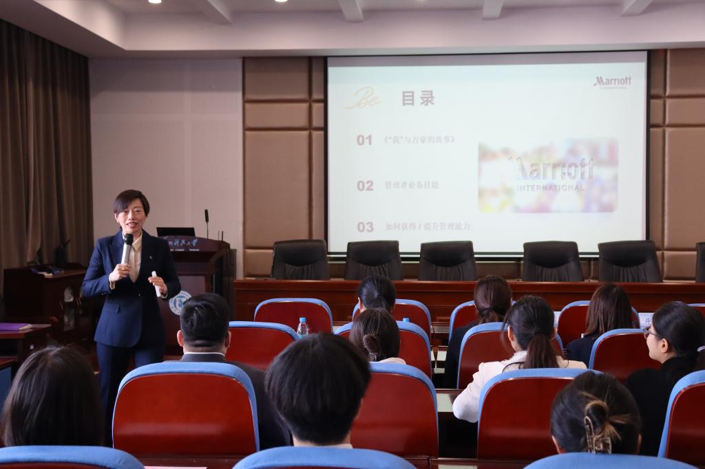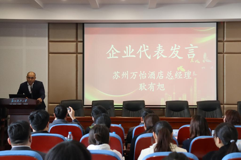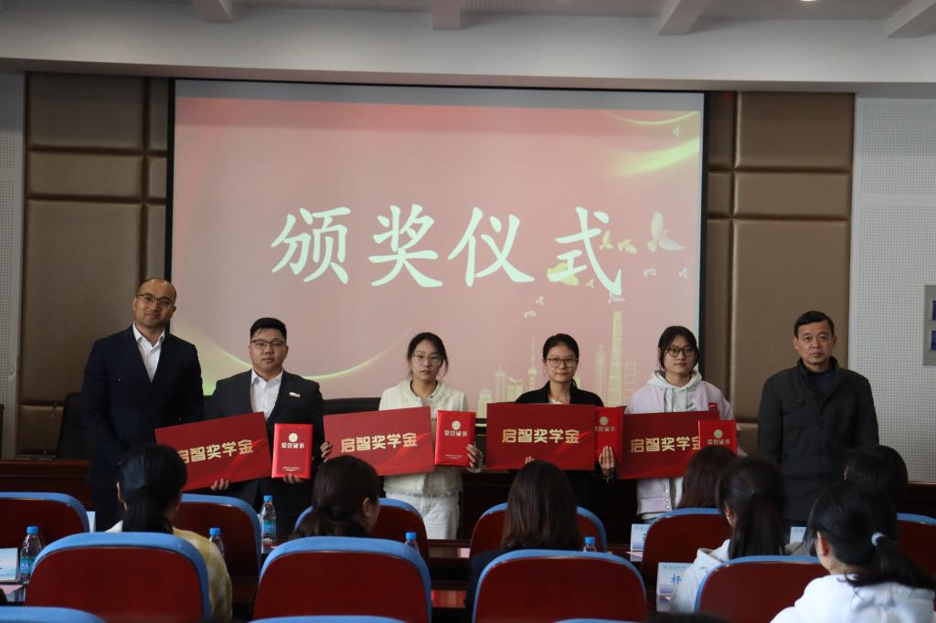 在报告厅举办启智企业奖学金颁奖典礼。苏州万怡酒店总经理耿有旭,苏州尼盛万丽酒店驻店经理蒋科竞,苏州太湖万豪万丽酒店人力资源部总监陈倩,开云体育