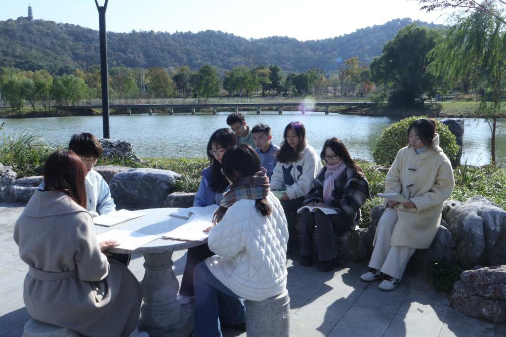 在湖心亭,同学们围绕“载人航天”精神开展户外读书分享会,主讲同学和分享同学畅所欲言,深刻感悟作为新时代大学生,要弘扬航天精神,不畏艰难,勇于创新。