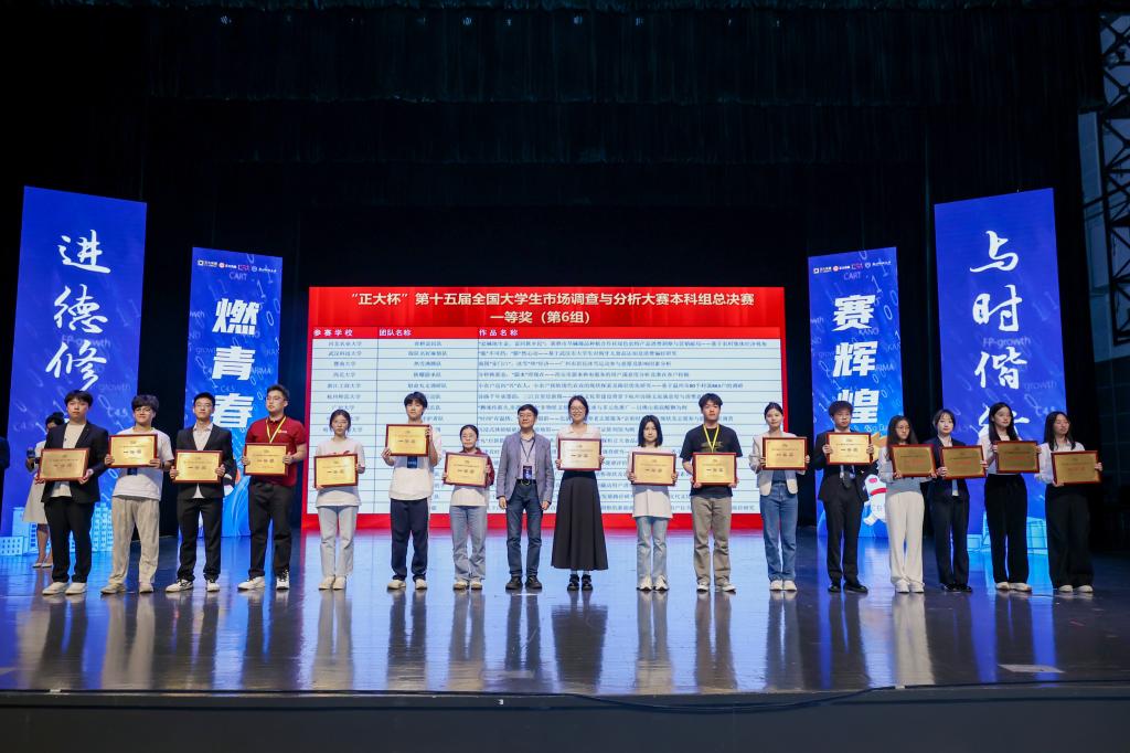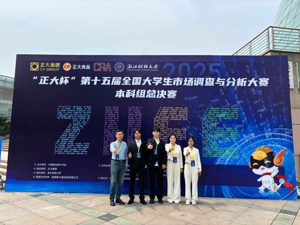 学生陈庆晰、杨洪晨、杨宇丰、裴思瑶、孙婷完成的作品《菜逢其时,预领未来:正大集团预制菜新产品市场调查研究——基于产品-消费者-行业的多维分析》(指导老师:郑作龙、王辉晖)经过理论知识赛、校赛、企业命题赛、省赛、全国赛初赛的层层选拔晋级全国总决赛,荣获全国一等奖,实现我校在该赛事国一的突破。