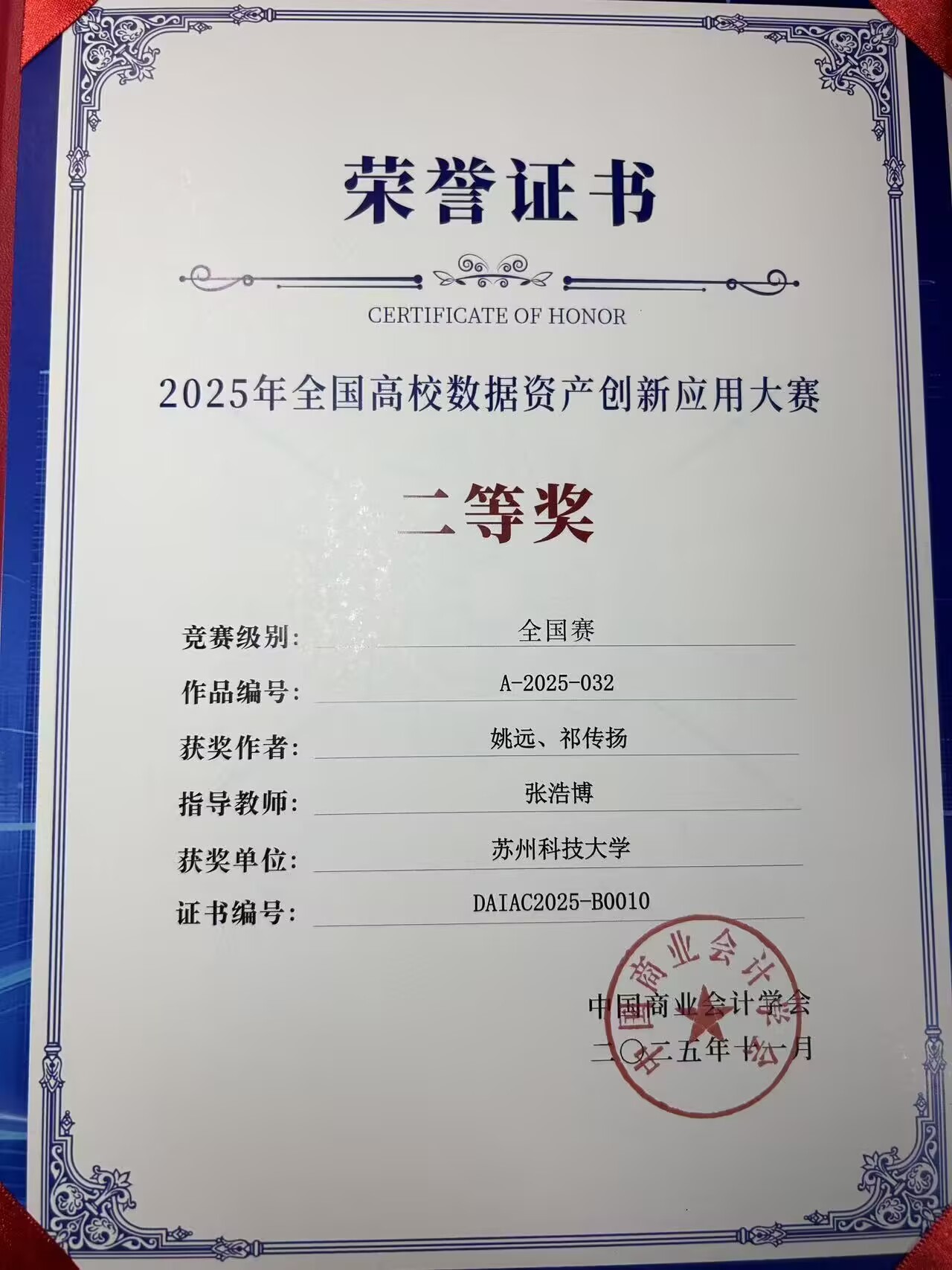 金融工程专业学生姚远、祁传扬完成的作品《区块链赋能第三方数据登记服务:基于数据产权三权分置的创新设计与实现》(指导老师张浩博)荣获本科组全国赛二等奖!