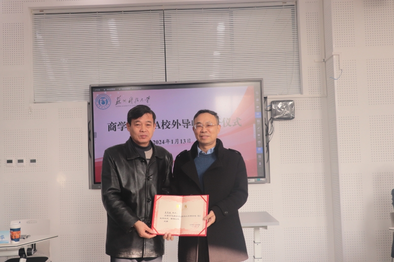 MBA项目的关心和支持表示感谢,为校外导师逐一颁发了聘任书。校外导师依次分享了自己的学习、工作经历和公司情况,表示将全力履行好导师职责,助力学校MBA项目发展。苏州元澄科技股份有限公司董事张君华,苏州企多多企业服务有限公司、上海钱智金融信息服务有限公司董事长胡玉建(我校1998届校友)分别以《面向山顶赤脚奔跑》《终身学习与企业发展》为题分享了成长和创业经历,并与学员进行了深入交流。